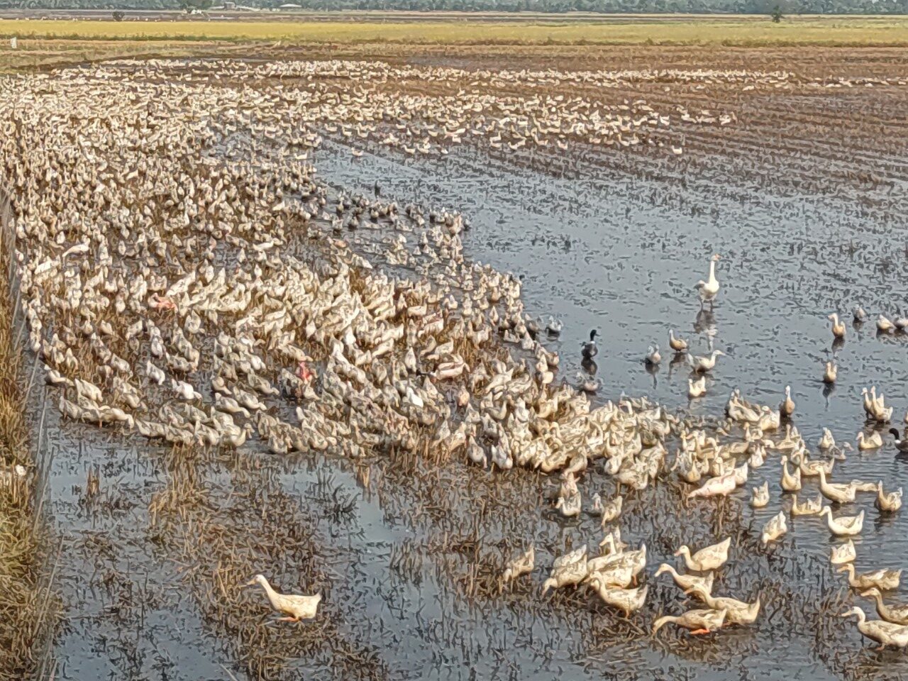 Vào thời điểm này, đi dọc các cánh đồng lúa ở vùng biên giới xã Vĩnh Phú (Giang Thành), sẽ gặp những túp lều nhỏ dựng ngay trên bờ ruộng. Ðó là nơi ăn, nghỉ của những người nuôi vịt chạy đồng. Những ruộng lúa vừa thu hoạch xong là nguồn thức ăn dồi dào – nơi chăn thả lý tưởng cho đàn vịt. Do đó, không quản xa xôi, dầm sương dãi nắng, những người nuôi vịt vẫn lùa đàn di chuyển hàng chục cây số tìm bãi thả.